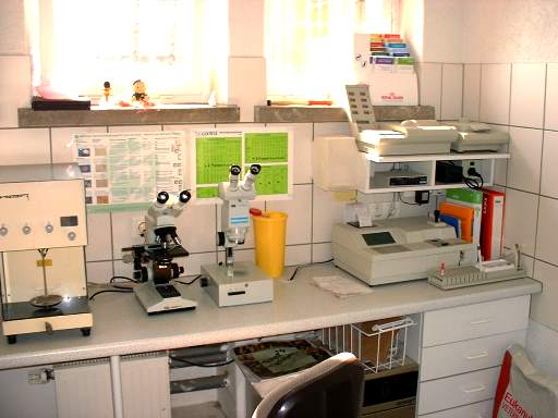 Hier Sind Sie in unserem Labor. Hier werden zum Beispiel blutchemische Untersuchungen, Blutbilder, parasitologische bakteriologische und zytologische Untersuchungen durchgeführt-